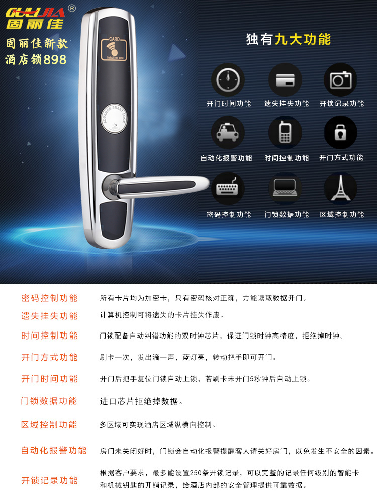 固丽佳智能酒店锁优势特点: